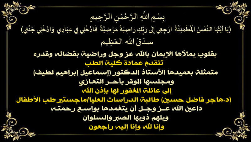 تتقدم عمادة كلية الطب متمثلة بعميدها الأستاذ الدكتور (إسماعيل إبراهيم لطيف) ومجلسها الموقر بأحــر التعـازي إلى عائلة المغفور لها بإذن الله (د.هاجر فاضل حسين) طالبة الدراسات العليا/ماجستير طب الأطفال داعين الله عــز وجــل أن يتغمدها بواسـع رحمتـه ويلهم ذويها الصبر والسلوان وإنا لله وإنا إليه راجعون