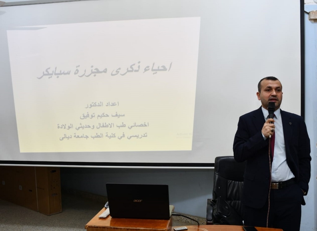 باشراف عميد كلية طب ديالى الاستاذ الدكتور اسماعيل ابراهيم لطيف اقامت وحدة الارشاد النفسي والتوجيه التربوي ندوة علمية بعنوان احياء ذكرى مجزرة سبايكر حاضر فيها المدرس سيف حكيم توفيق من فرع الاطفال.