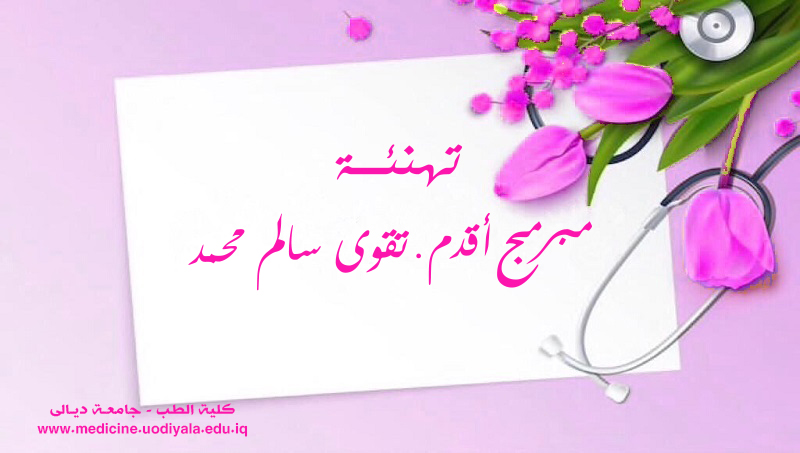 تتقدم عمادة كلية الطب متمثلة بعميدها الأستاذ الدكتور (إسماعيل إبراهيـم لطيف) بأحــــر التهانـــــي والتبريكـــــات إلى مبرمج أقدم (تقوى سالم محمد) بمناسبة اضافة شهادة الماجستير وحصولها على العنوان الوظيفي (مدرس جامعي) متمنين لها دوام الموفقية والتقدم العلمي خدمةً للمسيرة العلمية لرفع شأن كليتنا وجامعتنا وبلدنا العزيز العراق