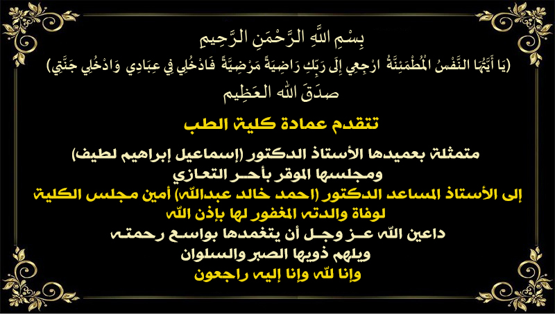 تتقدم عمادة كلية الطب متمثلة بعميدها الأستاذ الدكتور (إسماعيل إبراهيم لطيف) ومجلسها الموقر بأحــر التعـازي إلى الأستاذ المساعد الدكتور (احمد خالد عبدالله) أمين مجلس الكلية لوفاة والدته المغفور لها بإذن الله داعين الله عــز وجــل أن يتغمدها بواسـع رحمتـه ويلهم ذويها الصبر والسلوان وإنا لله وإنا إليه راجعون