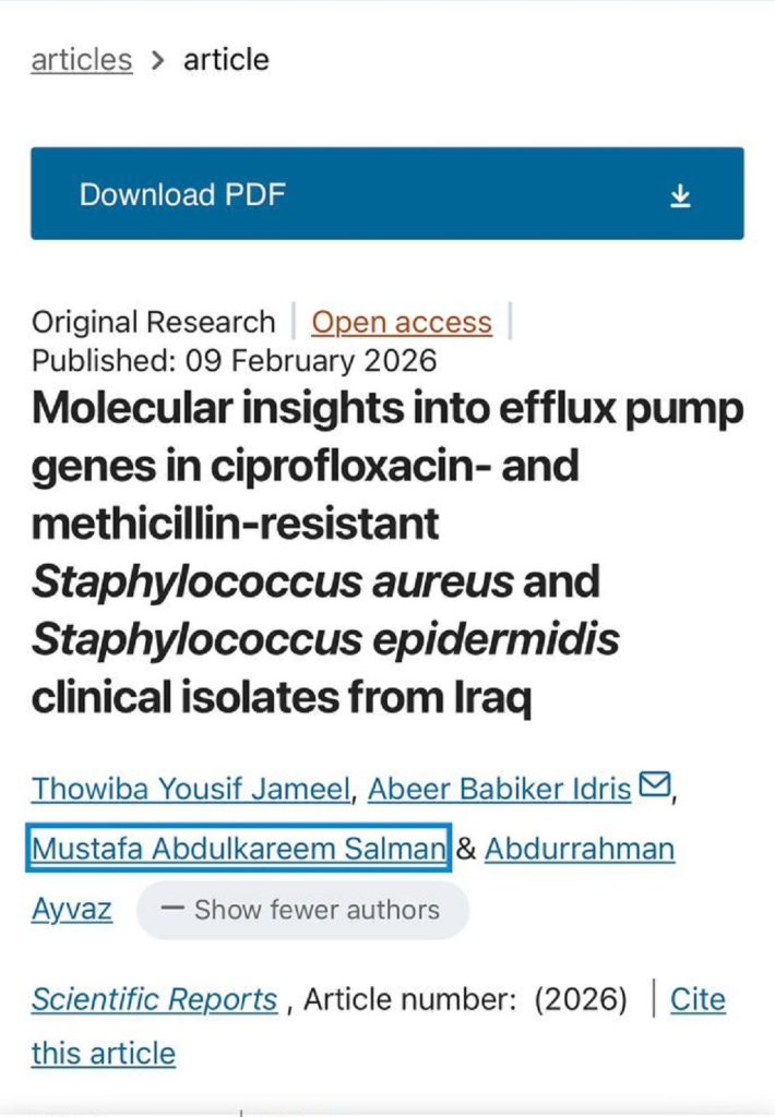 وتناولت الدراسة الآليات الجزيئية التي تمكّن بكتيريا Staphylococcus aureus وStaphylococcus epidermidis في العراق من مقاومة بعض المضادات الحيوية، حيث كشفت النتائج عن انتشار جينات ومتحوّرات تسهم في تعزيز قدرة البكتيريا على طرد تأثير الأدوية، الأمر الذي يقدّم تفسيرًا علميًا مهمًا لظاهرة مقاومة المضادات الحيوية.