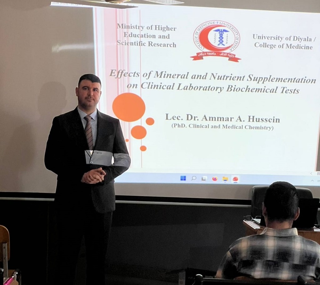 بإشراف عميد كلية طب ديالى الأستاذ الدكتور إسماعيل إبراهيم لطيف، أقامت شعبة التعليم المستمر ندوة علمية بعنوان (تأثير تناول مكملات المعادن والفيتامينات والمكملات الغذائية الشائعة على الفحوصات الكيميائية المختبرية السريرية)، حاضر فيها المدرس الدكتور عمار أحمد حسين من فرع الكيمياء الحياتية.