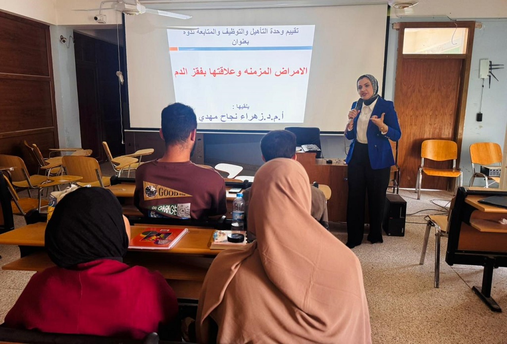 بإشراف عميد كلية طب ديالى الأستاذ الدكتور إسماعيل إبراهيم لطيف، أقامت وحدة التأهيل والتوظيف والمتابعة في الكلية ندوة علمية بعنوان (الأمراض المزمنة وعلاقتها بفقر الدم)، حاضرت فيها الأستاذ المساعد الدكتورة زهراء نجاح مهدي.