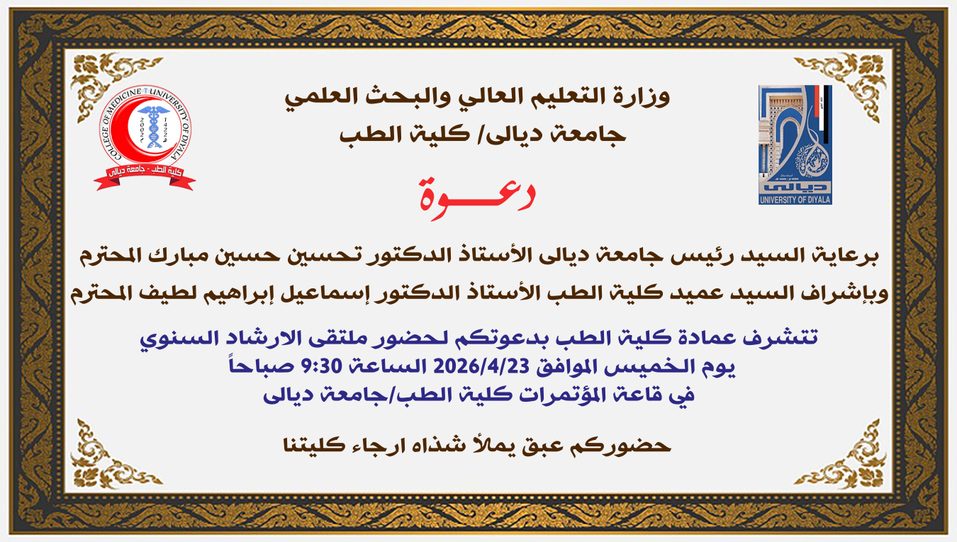 برعاية السيد رئيس جامعة ديالى الأستاذ الدكتور تحسين حسين مبارك المحترم وبإشراف السيد عميد كلية الطب الأستاذ الدكتور إسماعيل إبراهيم لطيف المحترم تتشرف عمادة كلية الطب بدعوتكم لحضور ملتقى الارشاد السنوي يوم الخميس الموافق 23/4/2026 الساعة 9:30 صباحاً في قاعة المؤتمرات كلية الطب/جامعة ديالى حضوركم عبق يملأ شذاه ارجاء كليتنا
